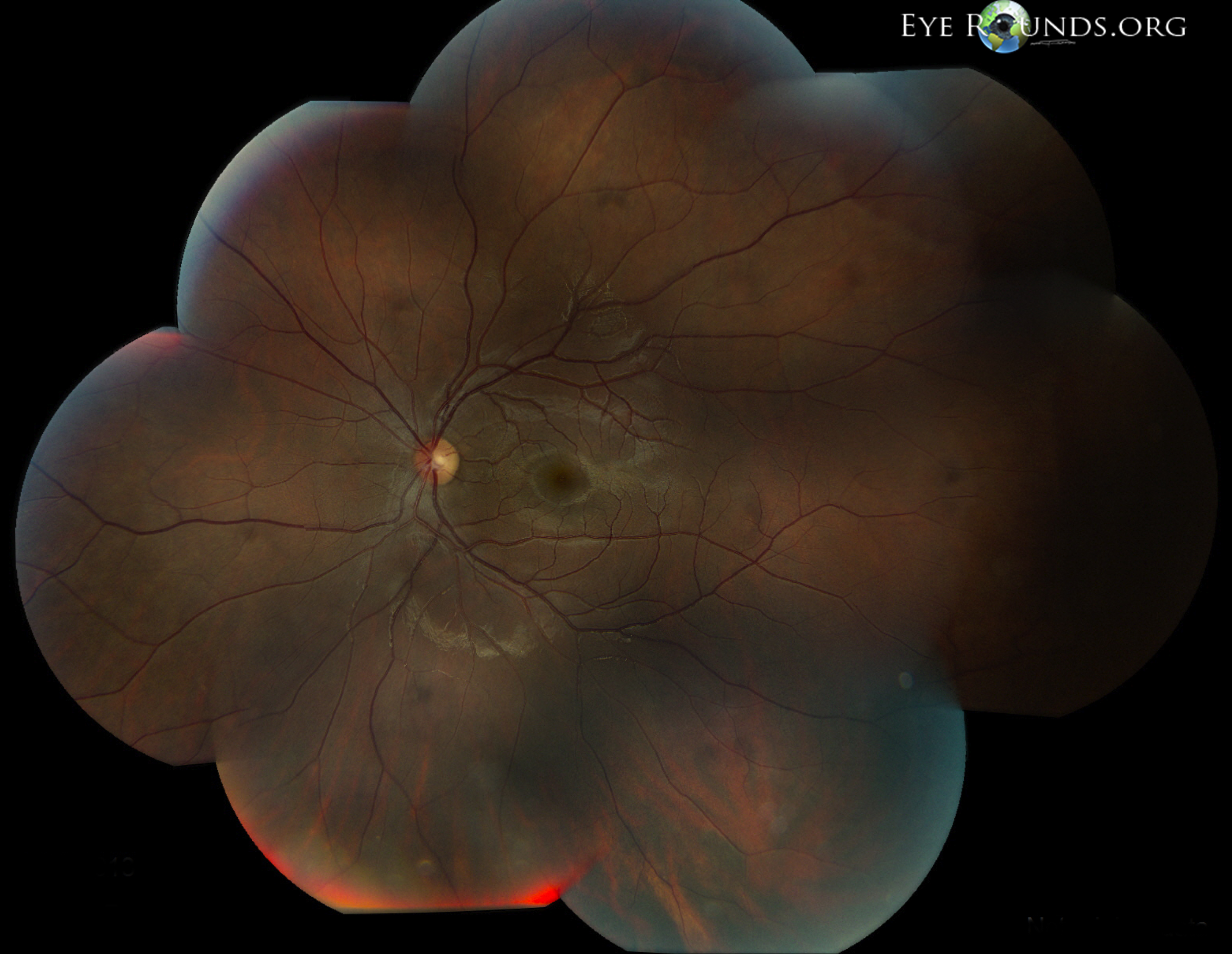 Typically, hyperpigmented scars of old and inactive lesions are present with recurrent "satellite lesions" at the border of healed scar. As a lesion heals, its borders become more defined and hyperpigmented. Large scars will have an atrophic center devoid of all retinal and choroidal elements. The underlying sclera gives the lesion its white center.[4]