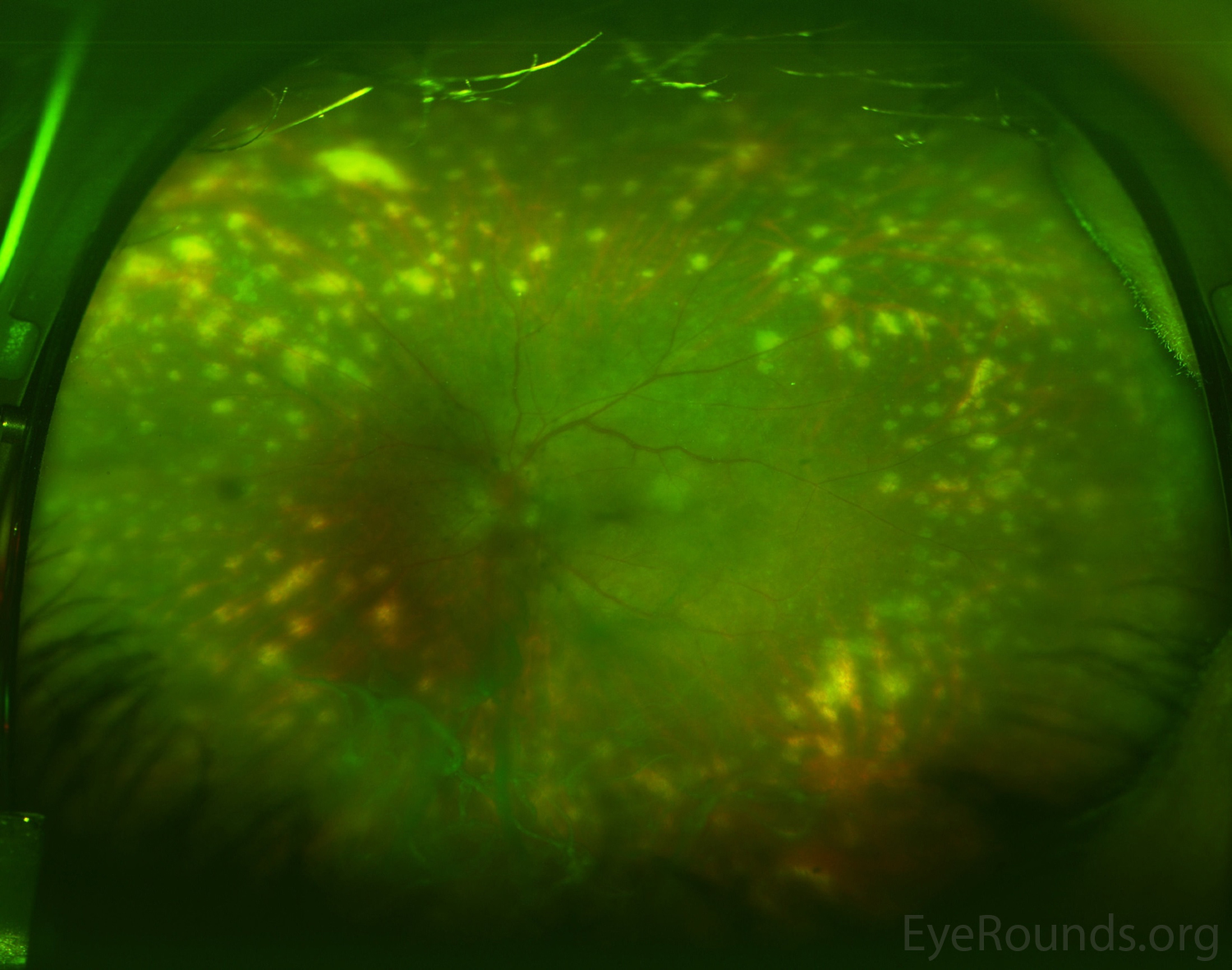 Despite initial treatment with mycophenolate mofetil (CellCept) for several months, the patient experienced worsening peripheral vision and persistent vitreous inflammation. He underwent surgical placement of a fluocinolone acetonide intravitreal implant (Retisert) for local, long-term inflammation control.