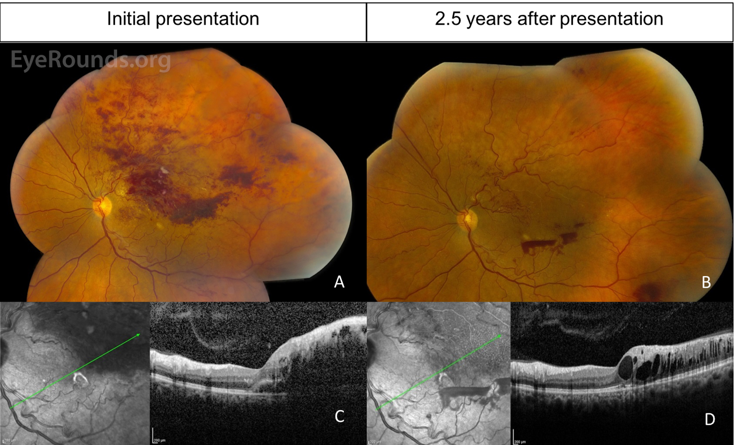 Figure 4. Color fundus photography, left eye: A. At her initial presentation to UIHC, there was a recurrent superotemporal BRVO along the superior arcade with massive intraretinal and retinal nerve fiber layer hemorrhages. B. At her most recent visit 2.5 years later, there were scattered intraretinal hemorrhages in the macula in addition to regions of NV in the superior macula and preretinal hemorrhages temporally and inferotemporally. Superotemporal sclerotic vessels were present. There was an area suspicious for an inferotemporal retinal arterial macroaneurysm in the mid-periphery. C-D. OCT showed improvement of subretinal fluid, but there was still persistence of intraretinal fluid when comparing the initial (C) and most recent (D) OCT images. The persistent of fluid with new NV was likely a result of the patient missing several appointments.