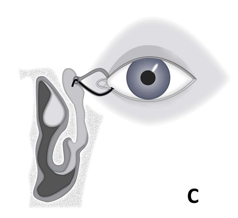 Normal tear drainage occurs with an intact nasolacrimal drainage system and a functioning lacrimal pump (Figure 1). Tears exit the ocular surface via the upper and lower puncta. They then enter the superior and inferior canaliculi, which coalesce to form a common canaliculus in 90% of people.[3] At the junction of the common canaliculus and the lacrimal sac is the valve of Rosenmueller, a small fold of mucous membrane. The sac narrows inferiorly, becoming the nasolacrimal duct, which opens beneath the inferior turbinate and into the inferior meatus of the nose. The valve of Hasner, located at the distal end of the nasolacrimal duct, prevents retrograde reflux of air, mucous, and food particles from the nose into the eye.
