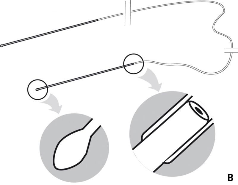 Figure 4. (A) Silicone tubing of the Ritleng stent connecting the upper and lower puncta. (B) Diagram of stent with stylette, compliments of FCI Ophthalmics