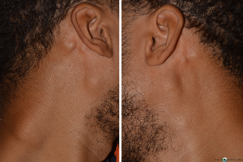 This 34-year-old African American male presented with a few months of blurry vision and photophobia. On exam, he was noted to have bilateral granulomatous anterior uveitis with large mutton-fat keratic precipitates, iris granulomas, enlarged lacrimal glands, and bilateral cervical and post-auricular lymphadenopathy. Laboratory testing revealed an angiotensin converting enzyme (ACE) level of 294 U/L (normal 8-52). He was referred to pulmonary medicine and diagnosed with sarcoidosis.