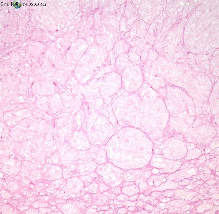 The nuclei have distinct, irregular nuclear membranes with large, eosinophilic nucleoli.