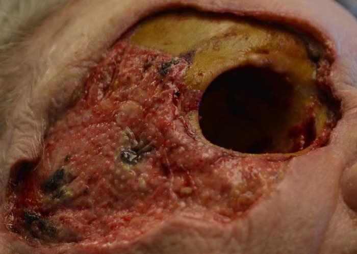 The patient was started on IV vancomycin and piperacillin-tazobactam, with the addition of clindamycin for its antitoxin effects. She was taken emergently to the operating room where a tissue biopsy revealed necrotizing fasciitis. She then underwent exenteration of the right orbit and radical debridement of right facial soft tissues (Figures 4 and 5). After exenteration, an MRI was ordered which was negative for bony involvement. A peripherally inserted central catheter (PICC) line was placed and the patient received IV piperacillin-tazobactam for three weeks. The wound began healing well with abundant granulation tissue (Figure 6), and she was discharged in good condition. Several months later, the patient expired due to unrelated causes.