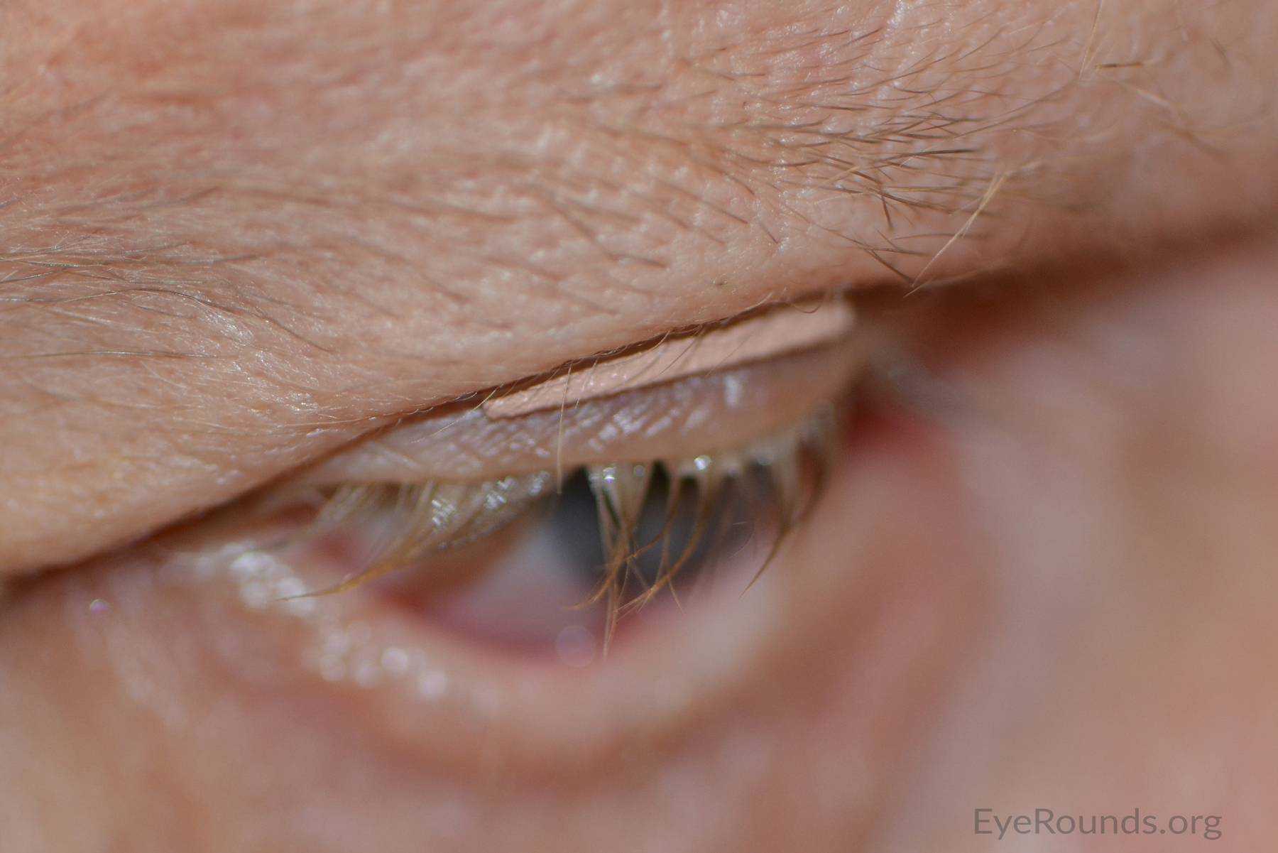 The patient continued to experience a significant degree of lagophthalmos and had to continue eyelid taping. He remained incapable of producing a complete blink or fully closing his right eye. Lower eyelid ectropion secondary to laxity was also present. Despite significant lagophthalmos, only minimal exposure keratopathy was present. At this point, the patient chose to defer placement of an eyelid weight so an external, stick-on weight was ordered instead.
