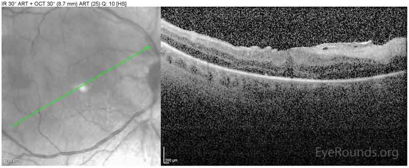 Figure 4. Spectral-domain OCT obtained the same day as the above photograph demonstrating development of an epiretinal membrane with distortion of the foveal contour.