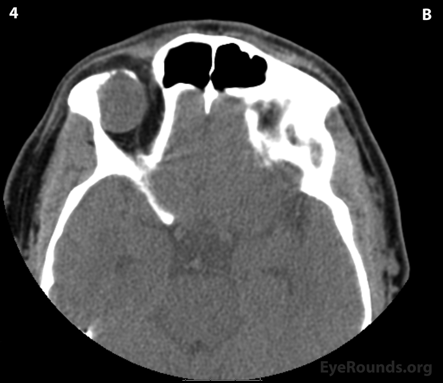 A 38-year-old male was referred to the University of Iowa oculoplastics service for evaluation of a right orbital mass. One year prior, he noticed progressive proptosis of the right eye (OD), gradual blurring of vision OD, and some occasional ache OD. He denied double vision, redness of the eye, or eyelid swelling. He had experienced repeated head/orbital/eye trauma during "street boxing" several years prior. He denied any previous eye or orbital surgery.