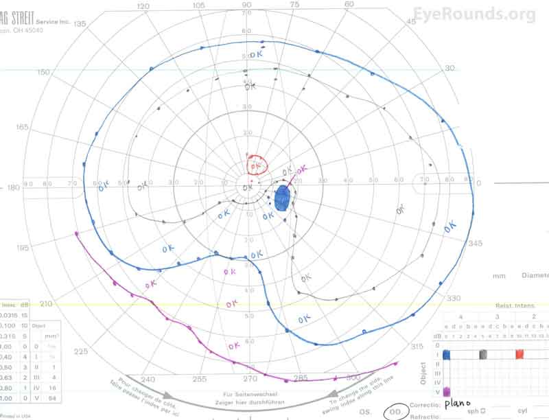 Figure 4: Goldmann visual field of the right eye showing inferonasal depression of all isopters.