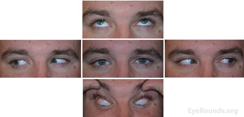 Figure 1: Cardinal gaze photos demonstrating right hypoglobus and motility restriction with limited supraduction OD and superior fullness of the right periorbital area.