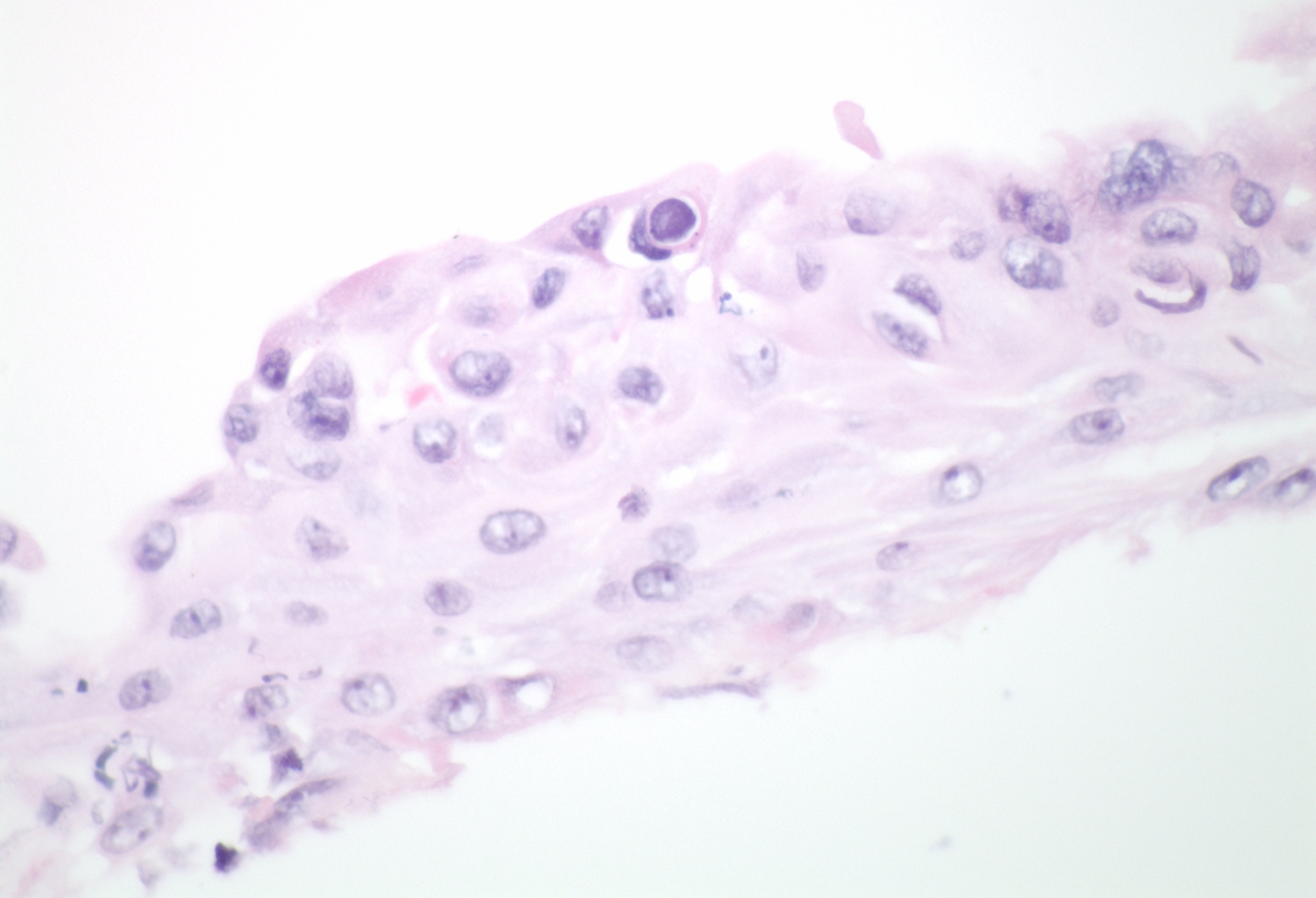 Diagnosis: Diagnosis depends largely upon the ability to directly visualize the Acanthamoeba organism, either by confocal microscopy in the living cornea or using light microscopy in histologic specimens. Traditionally, the diagnosis depended on attempts to culture the amoeba on a "lawn" of E. Coli on a non-nutrient agar bed, where the microbiologist would search for tracks of amoeba eating their way through the food source of bacteria. But this is a cumbersome, time-consuming, and costly effort that is not readily available at most laboratories. At the University of Iowa, we rely largely upon the rapid information that can be obtained directly in the examining lane from confocal microscopy combined with the results of corneal scraping analysis by the Ocular Pathology laboratory. With regards to histopathology, there are a wide variety of staining methods reported to identify the Acanthamoeba organism in tissue. Corneal scrapings, smears, or stromal biopsies can be stained with a variety of preparations. At the University of Iowa, we routinely use corneal scraping to obtain a sample and preserve the cells with a cytology fixative (Saccomano) at the time of collection. A cytospin technique is used to prepare the cytology slides. In some labs, these cells are subsequently prepared with Wright-Giemsa, Wheatly trichrome, Acridic Orange, calcofluor white staining, or periodic acid-Schiff staining techniques. At the University of Iowa, we have found that careful examination of an H&E specimen will often allow visualization of the classic double-walled cyst forms (see Figure 1) and identification of the organism. In fact, most ocular pathologists use the H&E stain to make the diagnosis, though the other stains mentioned may be employed. With a good confocal examination and a skilled pathologist, a diagnosis can often be made without taking deep biopsies of the corneal stroma or waiting for cultures to grow. This allows the physician to confidently begin appropriate treatment in a timely manner.
