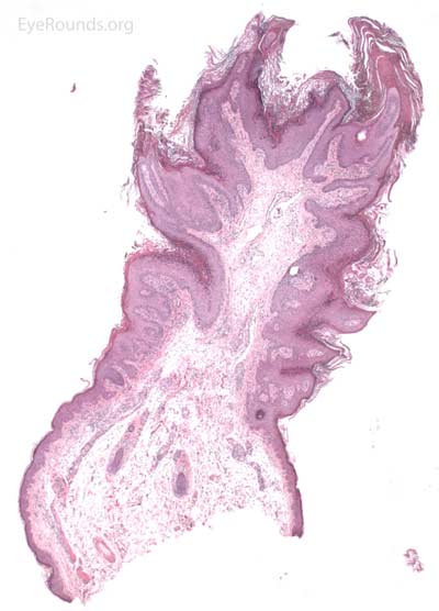 Pathologic specimens show a polypoid lesion with a fibrovascular stalk that contains loose, collagenous stroma surrounded by a mostly unremarkable epithelium. There are varying degrees of acanthosis and hyperkeratosis.